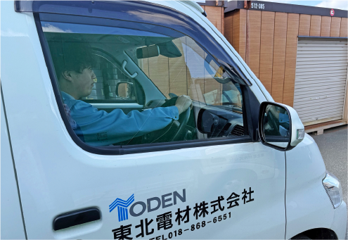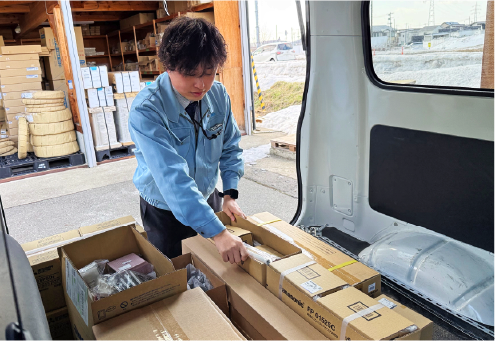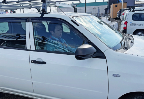 営業活動・打ち合わせチェックをした商品を積み込んでお客様の会社に訪問します。担当している由利本荘市と、にかほ市のエリアは移動距離が長いで交通事故に気を付けて運転します。